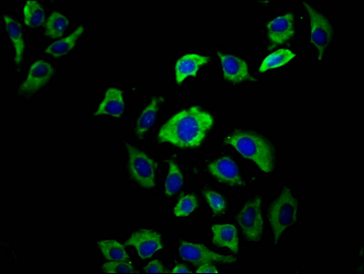 Immunofluorescence staining of A549 cells with CSB-PA769777LA01HU at 1:66, counter-stained with DAPI. The cells were fixed in 4% formaldehyde, permeabilized using 0.2% Triton X-100 and blocked in 10% normal Goat Serum. The cells were then incubated with the antibody overnight at 4°C. The secondary antibody was Alexa Fluor 488-congugated AffiniPure Goat Anti-Rabbit IgG(H+L).
