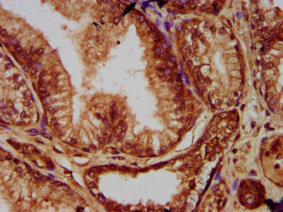 IHC image of CSB-PA769777LA01HU diluted at 1:200 and staining in paraffin-embedded human prostate cancer performed on a Leica BondTM system. After dewaxing and hydration, antigen retrieval was mediated by high pressure in a citrate buffer (pH 6.0). Section was blocked with 10% normal goat serum 30min at RT. Then primary antibody (1% BSA) was incubated at 4°C overnight. The primary is detected by a biotinylated secondary antibody and visualized using an HRP conjugated SP system.