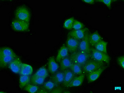 Immunofluorescence staining of Hela cells with CSB-PA007887LA01HU at 1:50, counter-stained with DAPI. The cells were fixed in 4% formaldehyde, permeabilized using 0.2% Triton X-100 and blocked in 10% normal Goat Serum. The cells were then incubated with the antibody overnight at 4°C. The secondary antibody was Alexa Fluor 488-congugated AffiniPure Goat Anti-Rabbit IgG(H+L).