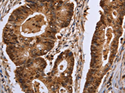 The image on the left is immunohistochemistry of paraffin-embedded Human colon cancer tissue using CSB-PA399518(EXTL3 Antibody) at dilution 1/30, on the right is treated with fusion protein. (Original magnification: ×200)