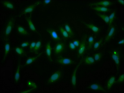 Immunofluorescence staining of Hela cells with CSB-PA857862LA01HU at 1:166, counter-stained with DAPI. The cells were fixed in 4% formaldehyde, permeabilized using 0.2% Triton X-100 and blocked in 10% normal Goat Serum. The cells were then incubated with the antibody overnight at 4°C. The secondary antibody was Alexa Fluor 488-congugated AffiniPure Goat Anti-Rabbit IgG(H+L).