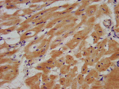 IHC image of CSB-PA857862LA01HU diluted at 1:500 and staining in paraffin-embedded human heart tissue performed on a Leica BondTM system. After dewaxing and hydration, antigen retrieval was mediated by high pressure in a citrate buffer (pH 6.0). Section was blocked with 10% normal goat serum 30min at RT. Then primary antibody (1% BSA) was incubated at 4°C overnight. The primary is detected by a biotinylated secondary antibody and visualized using an HRP conjugated SP system.