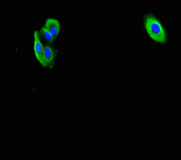 Immunofluorescent analysis of HepG2 cells using CSB-PA007924LA01HU at dilution of 1:100 and Alexa Fluor 488-congugated AffiniPure Goat Anti-Rabbit IgG(H+L)