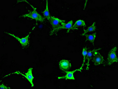Immunofluorescent analysis of MCF-7 cells using CSB-PA007938LA01HU at dilution of 1:100 and Alexa Fluor 488-congugated AffiniPure Goat Anti-Rabbit IgG(H+L)