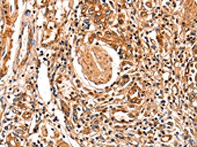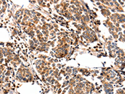 The image on the left is immunohistochemistry of paraffin-embedded Human stomach cancer tissue using CSB-PA066650(FABP7 Antibody) at dilution 1/25, on the right is treated with fusion protein. (Original magnification: ×200)