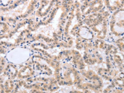 The image on the left is immunohistochemistry of paraffin-embedded Human thyroid cancer tissue using CSB-PA221364(FADD Antibody) at dilution 1/50, on the right is treated with fusion protein. (Original magnification: ×200)