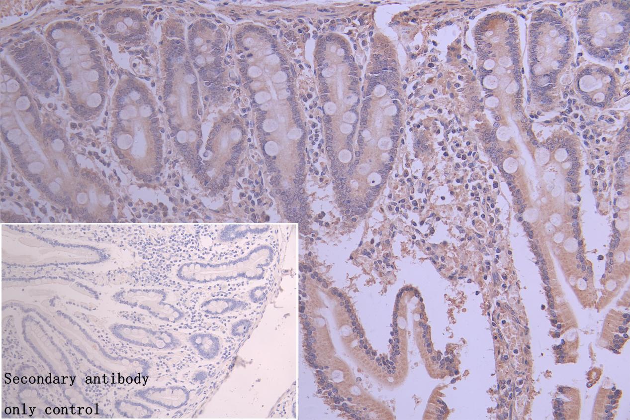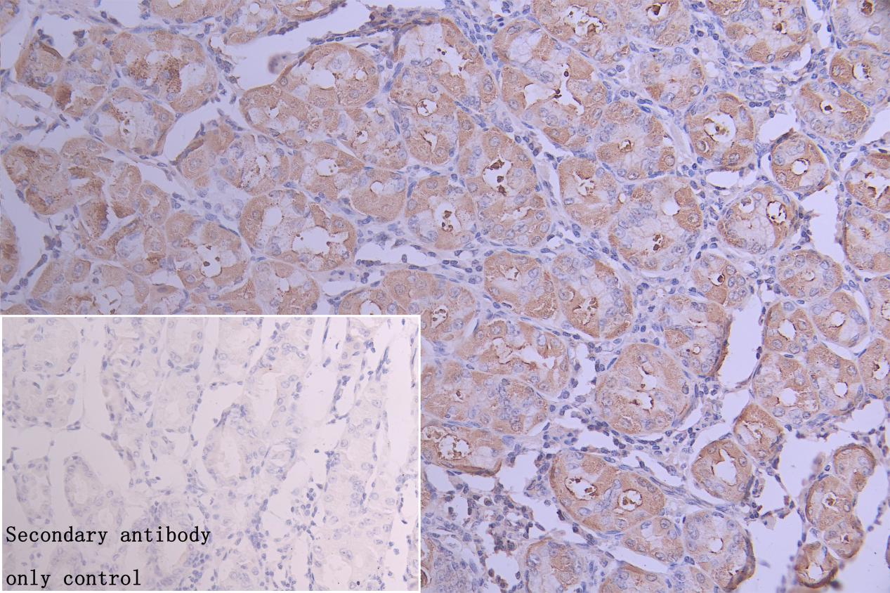 IHC image of CSB-PA887979LA01HU diluted at 1:300 and staining in paraffin-embedded human stomach tissue performed on a Leica BondTM system. After dewaxing and hydration, antigen retrieval was mediated by high pressure in a citrate buffer (pH 6.0). Section was blocked with 10% normal goat serum 30min at RT. Then primary antibody (1% BSA) was incubated at 4°C overnight. The primary is detected by a Goat anti-rabbit polymer IgG labeled by HRP and visualized using 0.05% DAB. Secondary antibody only control: uses 1% BSA instead of primary antibody