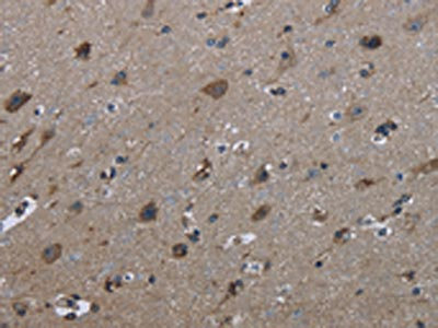 The image on the left is immunohistochemistry of paraffin-embedded Human brain tissue using CSB-PA290518(FAM89B Antibody) at dilution 1/30, on the right is treated with fusion protein. (Original magnification: ×200)