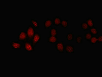 Immunofluorescent analysis of A549 cells using CSB-PA008469LA01HU at dilution of 1:100 and Cy3-congugated Goat Anti-Rabbit IgG
