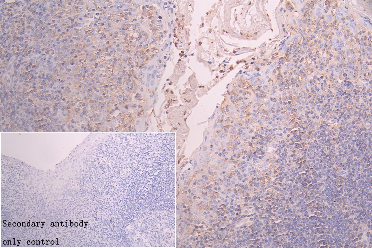 IHC image of CSB-PA854115ESR1HU diluted at 1:200 and staining in paraffin-embedded human tonsil tissue performed on a Leica BondTM system. After dewaxing and hydration, antigen retrieval was mediated by high pressure in a citrate buffer (pH 6.0). Section was blocked with 10% normal goat serum 30min at RT. Then primary antibody (1% BSA) was incubated at 4°C overnight. The primary is detected by a Goat anti-rabbit polymer IgG labeled by HRP and visualized using 0.05% DAB. Secondary antibody only control: uses 1% BSA instead of primary antibody