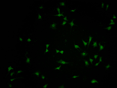 Immunofluorescence staining of SH-SY5Y cells with CSB-PA854107LA01HU at 1:100, counter-stained with DAPI. The cells were fixed in 4% formaldehyde and blocked in 10% normal Goat Serum. The cells were then incubated with the antibody overnight at 4°C. The secondary antibody was Alexa Fluor 488-congugated AffiniPure Goat Anti-Rabbit IgG(H+L).
