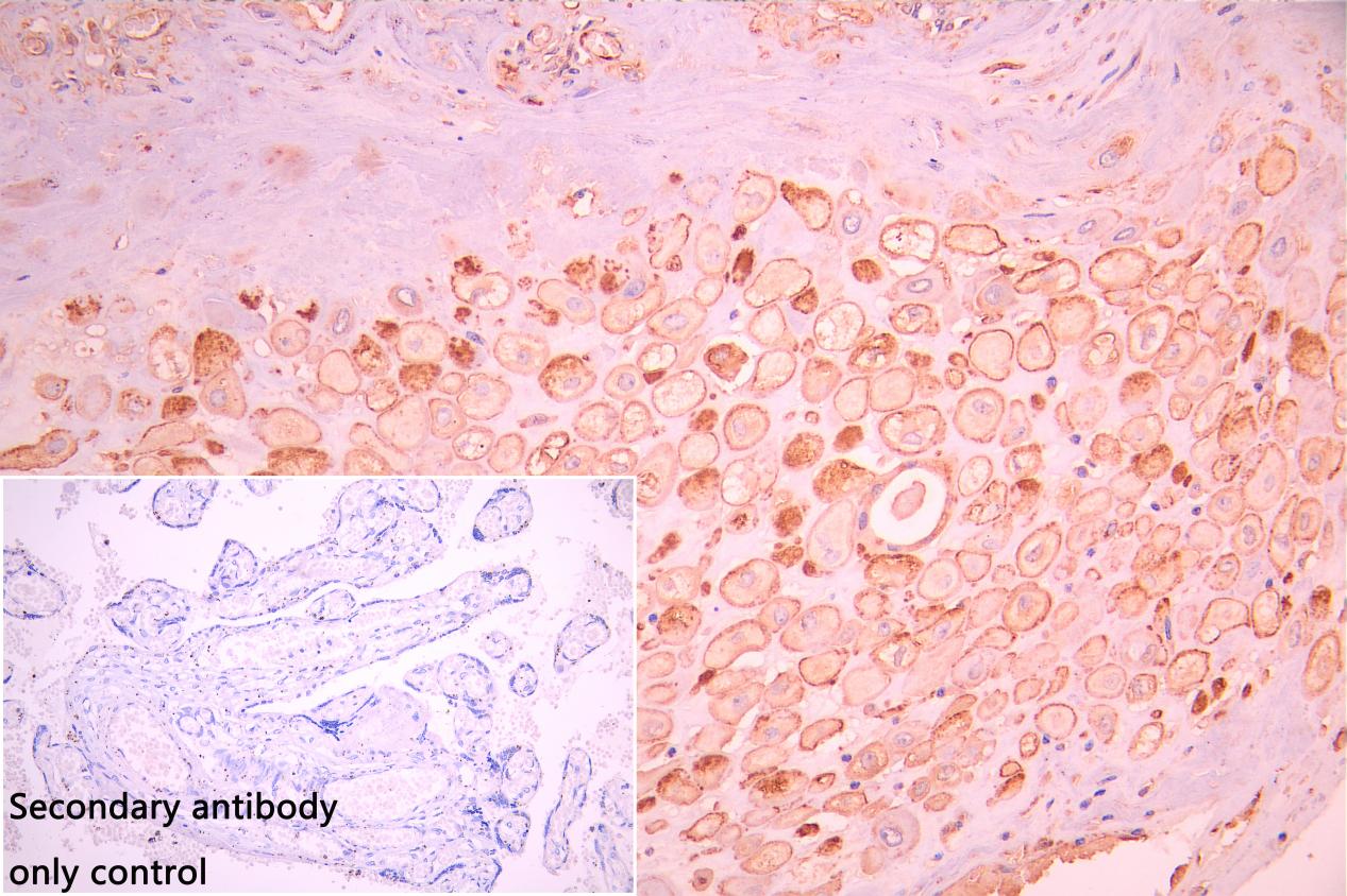 IHC image of CSB-PA10839A0Rb diluted at 1:50 and staining in paraffin-embedded human placenta tissue performed on a Leica BondTM system. After dewaxing and hydration, antigen retrieval was mediated by high pressure in a citrate buffer (pH 6.0). Section was blocked with 10% normal goat serum 30min at RT. Then primary antibody (1% BSA) was incubated at 4°C overnight. The primary is detected by a Goat anti-rabbit polymer IgG labeled by HRP and visualized using 0.05% DAB. Secondary antibody only control: uses 1% BSA instead of primary antibody