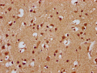 IHC image of CSB-PA858717LA01HU diluted at 1:300 and staining in paraffin-embedded human brain tissue performed on a Leica BondTM system. After dewaxing and hydration, antigen retrieval was mediated by high pressure in a citrate buffer (pH 6.0). Section was blocked with 10% normal goat serum 30min at RT. Then primary antibody (1% BSA) was incubated at 4°C overnight. The primary is detected by a biotinylated secondary antibody and visualized using an HRP conjugated SP system.