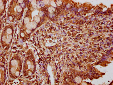 IHC image of CSB-PA858717LA01HU diluted at 1:300 and staining in paraffin-embedded human small intestine tissue performed on a Leica BondTM system. After dewaxing and hydration, antigen retrieval was mediated by high pressure in a citrate buffer (pH 6.0). Section was blocked with 10% normal goat serum 30min at RT. Then primary antibody (1% BSA) was incubated at 4°C overnight. The primary is detected by a biotinylated secondary antibody and visualized using an HRP conjugated SP system.