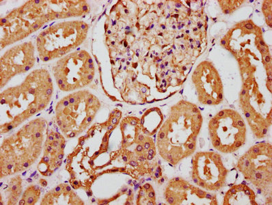 IHC image of CSB-PA008615ESR2HU diluted at 1:289 and staining in paraffin-embedded human kidney tissue performed on a Leica BondTM system. After dewaxing and hydration, antigen retrieval was mediated by high pressure in a citrate buffer (pH 6.0). Section was blocked with 10% normal goat serum 30min at RT. Then primary antibody (1% BSA) was incubated at 4°C overnight. The primary is detected by a biotinylated secondary antibody and visualized using an HRP conjugated SP system.