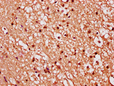 IHC image of CSB-PA008615ESR2HU diluted at 1:289 and staining in paraffin-embedded human brain tissue performed on a Leica BondTM system. After dewaxing and hydration, antigen retrieval was mediated by high pressure in a citrate buffer (pH 6.0). Section was blocked with 10% normal goat serum 30min at RT. Then primary antibody (1% BSA) was incubated at 4°C overnight. The primary is detected by a biotinylated secondary antibody and visualized using an HRP conjugated SP system.