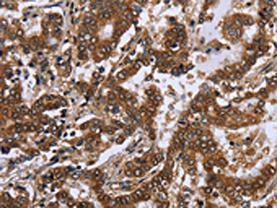 The image on the left is immunohistochemistry of paraffin-embedded Human liver cancer tissue using CSB-PA290047(FGF21 Antibody) at dilution 1/20, on the right is treated with fusion protein. (Original magnification: ×200)