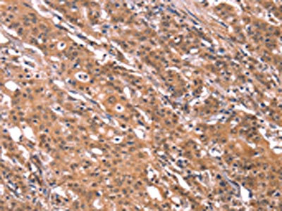 The image on the left is immunohistochemistry of paraffin-embedded Human gastic cancer tissue using CSB-PA077924(FGF22 Antibody) at dilution 1/20, on the right is treated with synthetic peptide. (Original magnification: ×200)