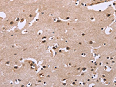 The image on the left is immunohistochemistry of paraffin-embedded Human brain tissue using CSB-PA449267(FGFR2 Antibody) at dilution 1/20, on the right is treated with synthetic peptide. (Original magnification: ×200)