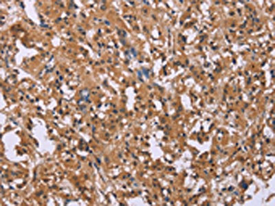 The image on the left is immunohistochemistry of paraffin-embedded Human thyroid cancer tissue using CSB-PA151107(FGFR2 Antibody) at dilution 1/20, on the right is treated with synthetic peptide. (Original magnification: ×200)