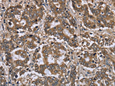 The image on the left is immunohistochemistry of paraffin-embedded Human liver cancer tissue using CSB-PA876389(FGL2 Antibody) at dilution 1/20, on the right is treated with fusion protein. (Original magnification: ×200)