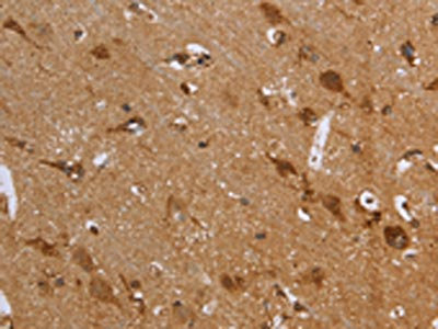 The image on the left is immunohistochemistry of paraffin-embedded Human brain tissue using CSB-PA045962(FH Antibody) at dilution 1/30, on the right is treated with fusion protein. (Original magnification: ×200)