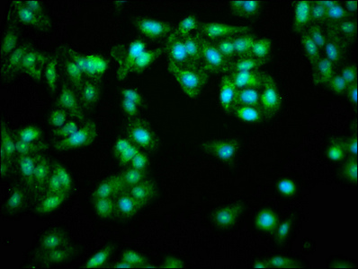 Immunofluorescence staining of HepG2 cells with CSB-PA11547A0Rb at 1:166, counter-stained with DAPI. The cells were fixed in 4% formaldehyde, permeabilized using 0.2% Triton X-100 and blocked in 10% normal Goat Serum. The cells were then incubated with the antibody overnight at 4°C. The secondary antibody was Alexa Fluor 488-congugated AffiniPure Goat Anti-Rabbit IgG(H+L).