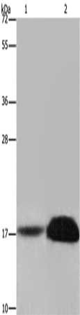 Gel: 8%SDS-PAGE, Lysate: 40 μg, Lane 1-2: Mouse kidney tissue, human kidney tissue, Primary antibody: CSB-PA182810(FHIT Antibody) at dilution 1/600, Secondary antibody: Goat anti rabbit IgG at 1/8000 dilution, Exposure time: 20 seconds