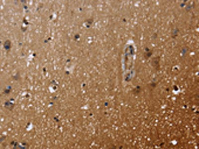 The image on the left is immunohistochemistry of paraffin-embedded Human brain tissue using CSB-PA977533(FHL3 Antibody) at dilution 1/40. (Original magnification: ×200)