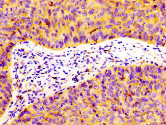IHC image of CSB-PA008727LA01HU diluted at 1:100 and staining in paraffin-embedded human cervical cancer performed on a Leica BondTM system. After dewaxing and hydration, antigen retrieval was mediated by high pressure in a citrate buffer (pH 6.0). Section was blocked with 10% normal goat serum 30min at RT. Then primary antibody (1% BSA) was incubated at 4°C overnight. The primary is detected by a biotinylated secondary antibody and visualized using an HRP conjugated SP system.