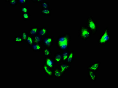 Immunofluorescence staining of Hela cells with CSB-PA008727LA01HU at 1:100, counter-stained with DAPI. The cells were fixed in 4% formaldehyde, permeabilized using 0.2% Triton X-100 and blocked in 10% normal Goat Serum. The cells were then incubated with the antibody overnight at 4°C. The secondary antibody was Alexa Fluor 488-congugated AffiniPure Goat Anti-Rabbit IgG(H+L).