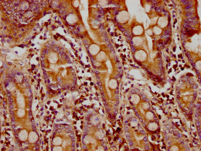 IHC image of CSB-PA715012LA01HU diluted at 1:300 and staining in paraffin-embedded human small intestine tissue performed on a Leica BondTM system. After dewaxing and hydration, antigen retrieval was mediated by high pressure in a citrate buffer (pH 6.0). Section was blocked with 10% normal goat serum 30min at RT. Then primary antibody (1% BSA) was incubated at 4°C overnight. The primary is detected by a biotinylated secondary antibody and visualized using an HRP conjugated SP system.