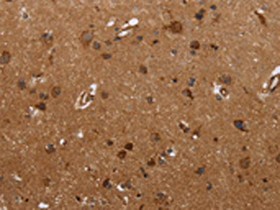 The image on the left is immunohistochemistry of paraffin-embedded Human brain tissue using CSB-PA947469(FMN2 Antibody) at dilution 1/30, on the right is treated with synthetic peptide. (Original magnification: ×200)