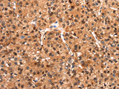 The image on the left is immunohistochemistry of paraffin-embedded Human liver cancer tissue using CSB-PA983101(FOXN2 Antibody) at dilution 1/15, on the right is treated with synthetic peptide. (Original magnification: ×200)