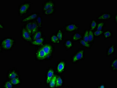 Immunofluorescent analysis of HepG2 cells using CSB-PA008855LA01HU at dilution of 1:100 and Alexa Fluor 488-congugated AffiniPure Goat Anti-Rabbit IgG(H+L)