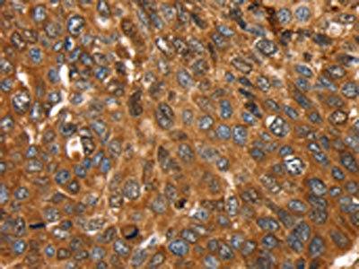 The image on the left is immunohistochemistry of paraffin-embedded Human esophagus cancer tissue using CSB-PA247700(FTH1 Antibody) at dilution 1/25, on the right is treated with fusion protein. (Original magnification: ×200)