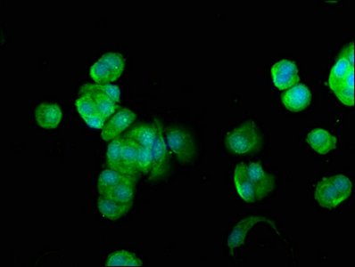Immunofluorescence staining of MCF-7 cells with CSB-PA847604LA01HU at 1:100, counter-stained with DAPI. The cells were fixed in 4% formaldehyde, permeabilized using 0.2% Triton X-100 and blocked in 10% normal Goat Serum. The cells were then incubated with the antibody overnight at 4°C. The secondary antibody was Alexa Fluor 488-congugated AffiniPure Goat Anti-Rabbit IgG(H+L).