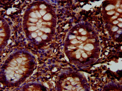 IHC image of CSB-PA847604LA01HU diluted at 1:300 and staining in paraffin-embedded human appendix tissue performed on a Leica BondTM system. After dewaxing and hydration, antigen retrieval was mediated by high pressure in a citrate buffer (pH 6.0). Section was blocked with 10% normal goat serum 30min at RT. Then primary antibody (1% BSA) was incubated at 4°C overnight. The primary is detected by a biotinylated secondary antibody and visualized using an HRP conjugated SP system.