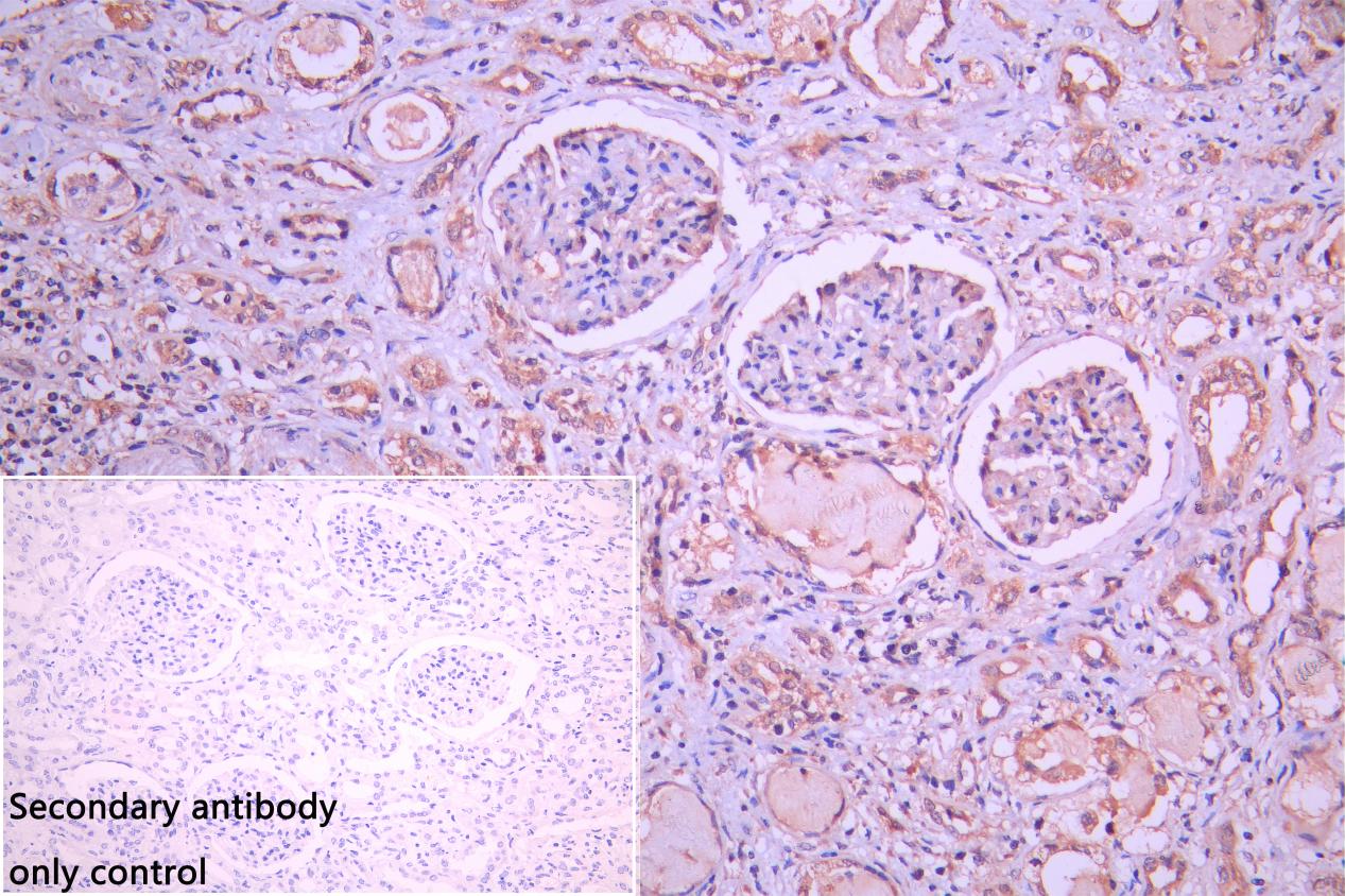 IHC image of CSB-PA816886LA01HU diluted at 1:250 and staining in paraffin-embedded human kidney tissue performed on a Leica BondTM system. After dewaxing and hydration, antigen retrieval was mediated by high pressure in a citrate buffer (pH 6.0). Section was blocked with 10% normal goat serum 30min at RT. Then primary antibody (1% BSA) was incubated at 4°C overnight. The primary is detected by a Goat anti-rabbit polymer IgG labeled by HRP and visualized using 0.05% DAB. Secondary antibody only control: uses 1% BSA instead of primary antibody