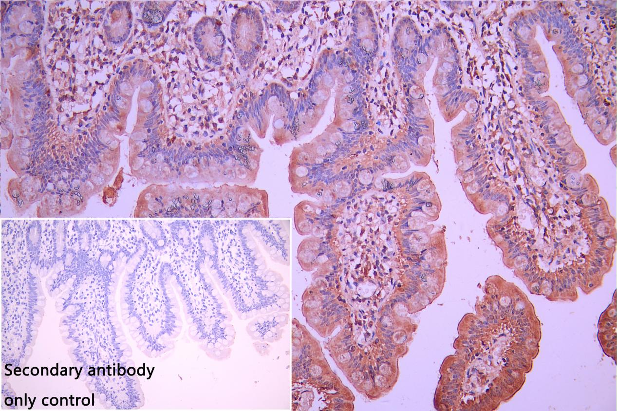 IHC image of CSB-PA816886LA01HU diluted at 1:250 and staining in paraffin-embedded human small intestine tissue performed on a Leica BondTM system. After dewaxing and hydration, antigen retrieval was mediated by high pressure in a citrate buffer (pH 6.0). Section was blocked with 10% normal goat serum 30min at RT. Then primary antibody (1% BSA) was incubated at 4°C overnight. The primary is detected by a Goat anti-rabbit polymer IgG labeled by HRP and visualized using 0.05% DAB. Secondary antibody only control: uses 1% BSA instead of primary antibody