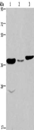 Gel: 8%SDS-PAGE, Lysate: 40 μg, Lane 1-3: Human bladder transitional cell carcinoma tissue, Human testis tissue, human transitional cell carcinoma of bladder tissue, Primary antibody: CSB-PA936198(FUT1 Antibody) at dilution 1/200, Secondary antibody: Goat anti rabbit IgG at 1/8000 dilution, Exposure time: 1 minute