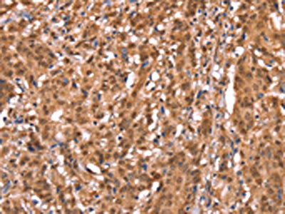The image on the left is immunohistochemistry of paraffin-embedded Human gastric cancer tissue using CSB-PA790564(FXR1 Antibody) at dilution 1/20, on the right is treated with synthetic peptide. (Original magnification: ×200)