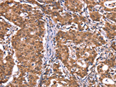 The image on the left is immunohistochemistry of paraffin-embedded Human gastric cancer tissue using CSB-PA018431(FXR1 Antibody) at dilution 1/20, on the right is treated with synthetic peptide. (Original magnification: ×200)