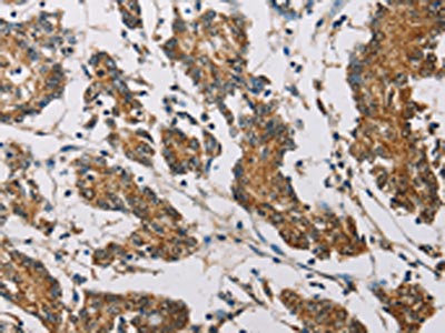 The image on the left is immunohistochemistry of paraffin-embedded Human colon cancer tissue using CSB-PA584842(FXYD1 Antibody) at dilution 1/60, on the right is treated with fusion protein. (Original magnification: ×200)