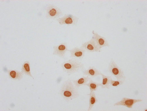 Immunocytochemistry analysis of CSB-PA010379OA140forHU diluted at 1:20 and staining in Hela cells(treated with 30mM sodium butyrate for 4h) performed on a Leica BondTM system. The cells were fixed in 4% formaldehyde, permeabilized using 0.2% Triton X-100 and blocked with 10% normal goat serum 30min at RT. Then primary antibody (1% BSA) was incubated at 4°C overnight. The primary is detected by a biotinylated secondary antibody and visualized using an HRP conjugated SP system.
