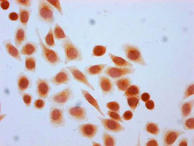 Immunocytochemistry analysis of CSB-PA010429OA77forHU diluted at 1:30 and staining in Hela cells (treated with 30mM sodium butyrate for 4h) performed on a Leica BondTM system. The cells were fixed in 4% formaldehyde, permeabilized using 0.2% Triton X-100 and blocked with 10% normal goat serum 30min at RT. Then primary antibody (1% BSA) was incubated at 4°C overnight. The primary is detected by a biotinylated secondary antibody and visualized using an HRP conjugated SP system.