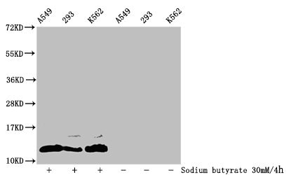 Detected samples: A549 whole cell lysate, 293 whole cell lysate, K562 whole cell lysate; Untreated (-) or treated (+) with 30mM sodium butyrate for 4h