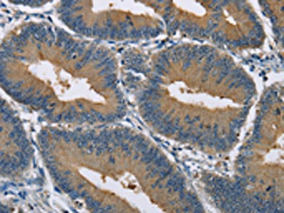 The image on the left is immunohistochemistry of paraffin-embedded Human colon cancer tissue using CSB-PA776568(GAB1 Antibody) at dilution 1/40, on the right is treated with fusion protein. (Original magnification: ×200)