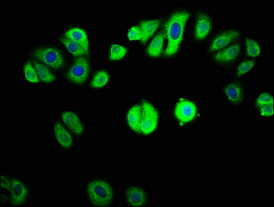 Immunofluorescence staining of HepG2 cells with CSB-PA614416LA01HU at 1:133, counter-stained with DAPI. The cells were fixed in 4% formaldehyde, permeabilized using 0.2% Triton X-100 and blocked in 10% normal Goat Serum. The cells were then incubated with the antibody overnight at 4°C. The secondary antibody was Alexa Fluor 488-congugated AffiniPure Goat Anti-Rabbit IgG(H+L).