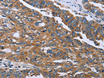 The image on the left is immunohistochemistry of paraffin-embedded Human ovarian cancer tissue using CSB-PA775340(GAB2 Antibody) at dilution 1/40, on the right is treated with fusion protein. (Original magnification: ×200)